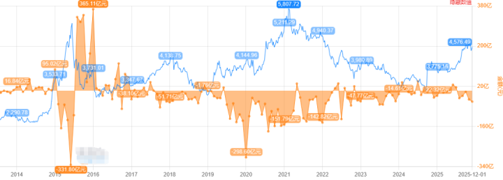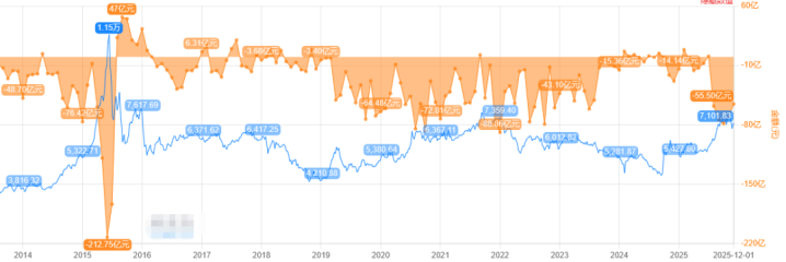 而2025年9月和10月,大股东的月减持金额达到了100亿以上,同样赶上了历次牛市的减持金额。